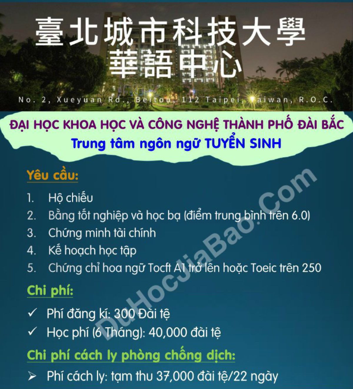 Sau hơn 2 năm tạm ngừng hệ ngôn ngữ tiếng Trung Đài Loan đã chính thức mở cửa hệ ngôn ngữ trở lại từ tháng 03/2022, Du Học Jia Bao xin thông báo tuyển sinh luôn tục hệ ngôn ngữ trường Đại Học TP Đài Bắc. Liên hệ ngay với chúng tôi để đăng ký và nhận thêm thông tin của 12 trường có mở hệ Ngôn Ngữ nhé !