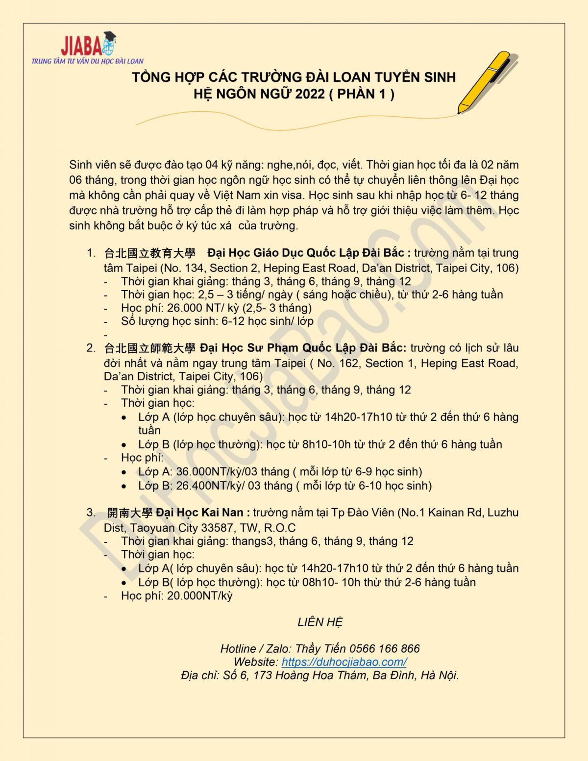 Sinh viên sẽ được đào tạo 04 kỹ năng: nghe,nói, đọc, viết. Thời gian học tối đa là 02 năm 06 tháng, trong thời gian học ngôn ngữ học sinh có thể tự chuyển liên thông lên Đại học mà không cần phải quay về Việt Nam xin visa. Học sinh sau khi nhập học từ 6- 12 tháng được nhà trường hỗ trợ cấp thẻ đi làm hợp pháp và hỗ trợ giới thiệu việc làm thêm. Học sinh không bắt buộc ở ký túc xá của trường. Sau đây du học Đài Loan Jia Bao sẽ tổng hợp các trường Đài Loan tuyển sinh hệ ngôn ngữ 2022 nhé: